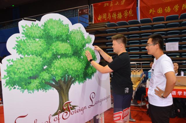 迎新接待站的外围,摆放着一棵象征着外院新生力量的“青春之树”。新同学们纷纷在便签上写下自己初入外院的心情和对未来的期许,将之粘贴在“树”上,并在志愿者的引导下同外院“朋友圈”展板合影留念。新同学们灿烂的笑容,成为报到当天最美的风景。